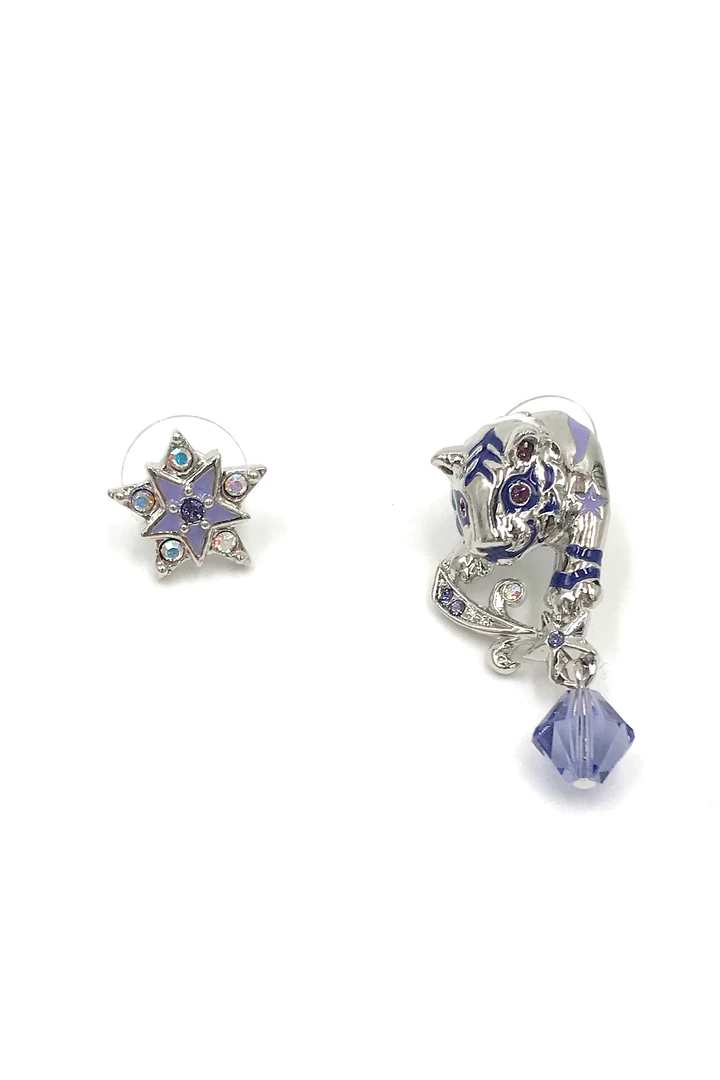 - Asymmetrical tiger earrings with purple gemstone details